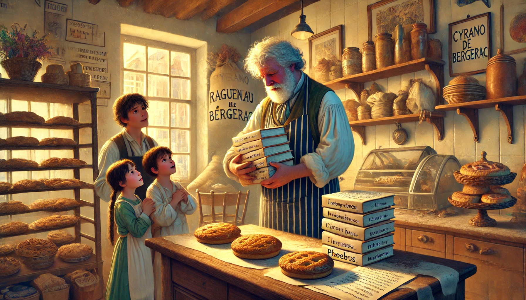 Scene 2. III. in Cyra­no de Berg­er­ac brings a delight­ful yet emo­tion­al moment as it takes place in Rague­neau’s bak­ery, filled with both warmth and lit­er­ary pas­sion. Rague­neau, a bak­er by trade, is deeply invest­ed in lit­er­a­ture, and this is revealed when two chil­dren come into the shop ask­ing for three pies. As he pre­pares the order, his dis­tress over using his pre­cious poet­ry bags as pack­ag­ing high­lights his deep attach­ment to his writ­ten works. Each bag, con­tain­ing poems that reflect his love for the art, such as mus­ings on Ulysses and Pene­lope or the gold­en locks of Phoe­bus, rep­re­sents a per­son­al con­nec­tion to his cre­ations. His reluc­tance to part with these bags shows a con­flict with­in him­self, caught between his pas­sion for poet­ry and his prac­ti­cal life as a bak­er, where the needs of his busi­ness clash with his emo­tion­al attach­ment to the writ­ten word.