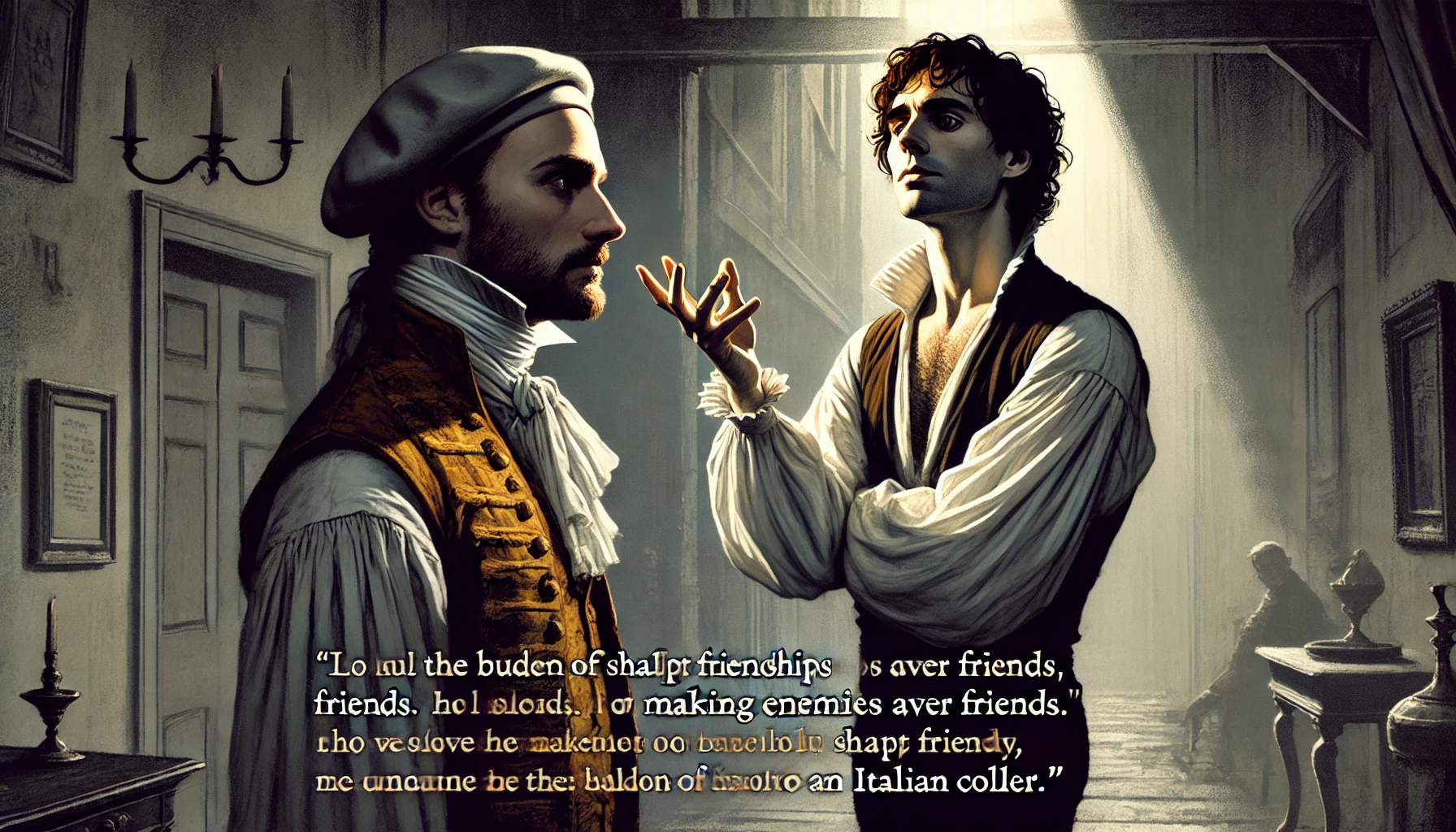 Scene 2. IX. of Cyra­no de Berg­er­ac vivid­ly por­trays themes of pride, hon­or, and the con­se­quences of chal­leng­ing soci­etal norms through the intense con­ver­sa­tions between the char­ac­ters. Cyra­no makes it clear that he prefers to have ene­mies rather than friends, a stance that con­founds his friend, Le Bret. Cyra­no finds sat­is­fac­tion in defy­ing expec­ta­tions and ridi­cul­ing super­fi­cial friend­ships, which he sees as shal­low and with­out integri­ty. To him, true hon­or is found in resist­ing ease and com­fort; he com­pares the weight of shal­low friend­ships to the sti­fling effect of an Ital­ian col­lar. In his view, the dis­com­fort of hav­ing ene­mies is a more accu­rate rep­re­sen­ta­tion of pride and hon­or, as it forces one to live with a sense of pur­pose and moral clar­i­ty, free from soci­etal con­straints.