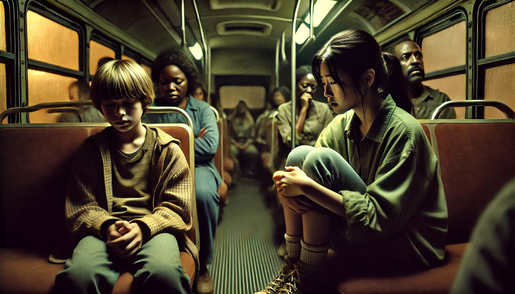 As the bus moves along, the sit­u­a­tion grows more intense when Mibs notices Lester strug­gling to secure the bro­ken win­dows. The sight of Lester grap­pling with the dam­age brings Mibs into the role of care­tak­er, even though she feels entire­ly unpre­pared. She is forced to step into the respon­si­bil­i­ty of tend­ing to the injuries of the oth­er pas­sen­gers, some­thing she does reluc­tant­ly but with­out ques­tion. Bobbi’s sharp remarks and the dis­com­fort of the oth­er pas­sen­gers only add weight to Mibs’ shoul­ders, mak­ing the ten­sion pal­pa­ble. Despite her doubts, Mibs push­es for­ward, deter­mined to help not just out of duty but also in an attempt to redeem her­self in her own eyes. She is dri­ven by a need to prove that she can be of val­ue in this time of cri­sis. How­ev­er, the more Mibs tries to help, the more her inter­nal strug­gle grows. The grow­ing dis­com­fort and judg­ment from the peo­ple around her make her feel like a mis­fit, but she stays focused, push­ing through her fear and doubts for the sake of the oth­ers.