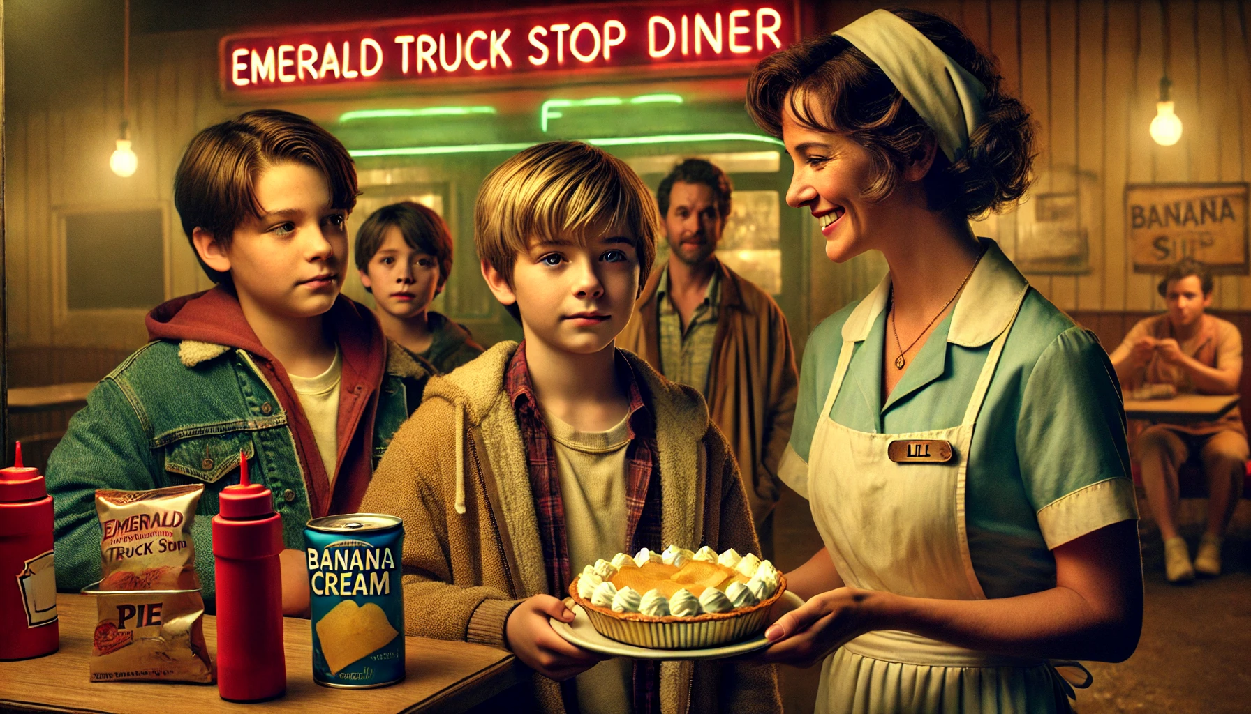 byChapter XVII takes the group toward the town of Emerald, where the protagonist, along with their companions, has a surprising encounter with Samson, the narrator’s seven-year-old brother. He quietly stands next to Fish, holding an empty bag of potato chips, his silent presence adding to the mystery of his character. Lill, who is with the group, is taken aback by Samson’s unexpected appearance and learns that he is a quiet and reserved child, not one to engage in many words. This piques the curiosity of the group, adding an air of suspense as they begin to realize how unusual their situation truly is. As the children begin to feel the pangs of hunger, Fish makes a casual comment about how it’s well past the time for supper, highlighting their growing need for nourishment. Lill, a waitress at the Emerald Truck Stop Diner, responds to their discomfort by acknowledging her tardiness in getting food, yet sympathizing with the group’s struggles. She generously offers to treat them to a meal, including a banana cream pie, much to everyone’s surprise, particularly Samson, who is typically shy and doesn’t speak often. However, when Samson does speak, it is with a deep and husky voice, expressing his craving for the banana cream pie, which brings a lighthearted moment to an otherwise tense atmosphere. His simple request offers a sense of relief and creates a shared moment of levity among the group.