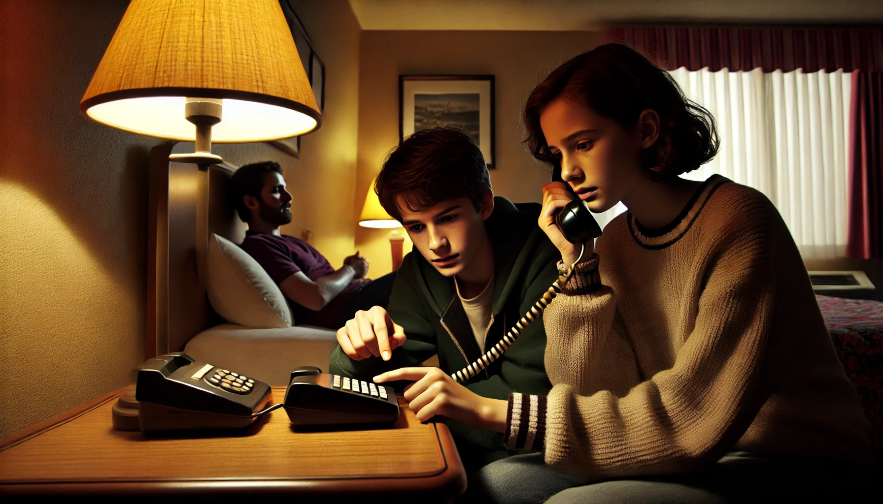 The ten­sion builds fur­ther when Lill inspects the motel rooms and assigns the girls and boys to sep­a­rate accom­mo­da­tions, a small task that takes on added sig­nif­i­cance in this moment. With every­thing still uncer­tain, the nar­ra­tor shifts into a lead­er­ship role, giv­ing Fish spe­cif­ic instruc­tions on how to han­dle any incom­ing calls with­out giv­ing away the truth. Lill, aware of how con­cerned the children’s par­ents must be, encour­ages Bob­bi to call home and reas­sure her fam­i­ly about their well-being. With Lill momen­tar­i­ly dis­tract­ed by a trip to the bath­room, the nar­ra­tor seizes the oppor­tu­ni­ty to care­ful­ly guide Bob­bi on how to approach the con­ver­sa­tion, ensur­ing she remains calm and that their sto­ry stays con­sis­tent. This plan­ning gives Bob­bi the tools she needs to act con­vinc­ing­ly, while the narrator’s aware­ness of the poten­tial con­se­quences keeps the pres­sure high.