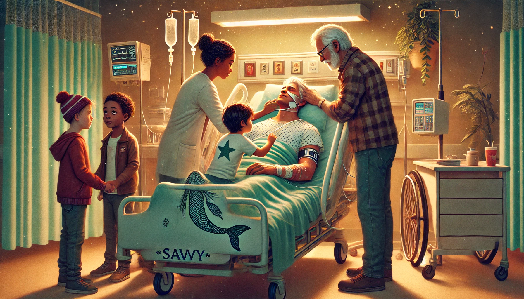 The family’s presence in the room reflects their love and concern for Poppa. Grandpa Bomba, though clearly shaken by the circumstances, tries to distract himself by attempting to open a jar, his actions a small attempt to cling to normalcy. Rocket steps in, offering his help with the jar while softly singing the familiar love song that symbolizes the bond between Poppa and Momma. These simple acts, though small, offer a sense of comfort and familiarity amidst the overwhelming sadness. Meanwhile, the protagonist gently touches Poppa’s face, her fingers tracing the lines of his skin, reflecting on the difference between his condition and the homeless man she once encountered—someone who, unlike Poppa, had no one to care for him. She recalls Poppa’s faded tattoo of a mermaid, Miss Mermaid, which once seemed to represent his vitality and life. Now, that image seems distant, a symbol of a time when Poppa was a different person, and the protagonist yearns to re-establish the connection they once shared.